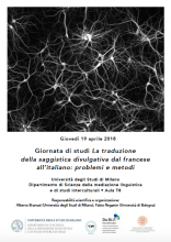 La giornata di studi La traduzione della saggistica divulgativa dal francese all’italiano: problemi e metodi intende da un lato verificare la fondatezza dell’opposizione invalsa nel mondo dell’editoria e delle biblioteche tra testi letterari in prosa (testi di finzione) e saggi di alta divulgazione appartenenti sia a discipline umanistiche che a discipline scientifiche (testi informativi); dall’altro, indagare metodi e problemi linguistici propri della traduzione dal francese in italiano dei saggi destinati non solo agli specialisti ma anche, più in generale, al pubblico colto.  19.04.2018 Università degli Studi di Milano Dipartimento di Scienze della Mediazione Linguistica e di Studi Interculturali • Aula T8 • Polo di Mediazione Interculturale e Comunicazione Responsabilità scientifica e organizzazione: Alberto Bramati (Università degli Studi di Milano)  Fabio Regattin (Università di Bologna). Con il patrocinio di: Dipartimento di Scienze della Mediazione Linguistica e di Studi Interculturali (Università degli Studi di Milano) Dipartimento di Lingue, Letterature e Culture moderne (Università di Bologna) Do.Ri.F. Università - Centro di Documentazione e di Ricerca per la Didattica della Lingua Francese nell'Università Italiana   PROGRAMMA DELLA GIORNATA 9.00 Saluto delle autorità Giovanni Turchetta (Direttore, Dipartimento di Scienze della Mediazione)  Dino Gavinelli (Presidente, Scuola di Scienze della Mediazione)  Marie-Christine Jullion (Professore ordinario di Lingua e traduzione francese) 9.15 Introduzione dei lavori  Alberto Bramati, Fabio Regattin I. La traduzione della saggistica: uno sguardo ermeneutico Presiede Alberto Bramati 9.30 Silvana Borutti (Università degli Studi di Pavia)  Traduzione come dialogo interlinguistico e rienunciazione 10.00 Charles Le Blanc (Université d’Ottawa)  Echi di letture nella traduzione delle scienze umane 10.30 Discussione e pausa II. La traduzione della saggistica: analisi linguistiche Presiede Marie-Christine Jullion 11.00 Alberto Bramati (Università degli Studi di Milano)  Un saggio di critica d’arte in forma di monologo: La toison de Madeleine di Daniel Arasse 11.30 Fabio Regattin (Università di Bologna)  Tradurre darwinismi: Patrick Tort e Dan Sperber in italiano 12.00 Chiara Lusetti (Università degli Studi di Milano)  Les damnés de la terre di Frantz Fanon: la traduzione di Cignetti per Einaudi cinquant’anni dopo 12.30 Discussione e pausa pranzo III. La traduzione della saggistica nella pratica editoriale Presiede Fabio Regattin 14.30 Emanuele Lana (traduttore)  La traduzione come gioco di ruolo 15.00 Sara Crimi (traduttrice)  Tradurre il broken French nella saggistica 15.30 Francesca Del Moro (redattrice)  I vari livelli della revisione del testo applicata alla traduzione della saggistica divulgativa 16.00 Luna Orlando (editor)  Variazioni sul tradurre 16.30 Discussione e chiusura dei lavori