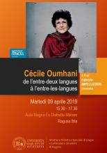 Martedì 09 aprile 2019, 15.30-17-30, "Cécile Oumhani de l’entre-deux langues à l’entre-les-langues", seminario di studio sull’etnotesto e il plurilinguismo nella scrittura contemporanea tra migrazione e identità, Aula Magna Ex Distretto Militare, Struttura Didattica Speciale di Lingue e Letterature Straniere di Ragusa (Ragusa Ibla), Università degli Studi di Catania. Organizzatore: Fabrizio Impellizzeri
